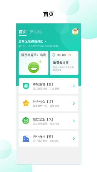 答:“餐饮安心码”作为餐饮企业的电子身份证照,“一店一码”作为企业“自画像”,能够更准确、更可靠、更真实的展示企业基础数据信息,如果餐饮企业食品安全状态和消费者满意度良好,绿色的笑脸展示后能为餐饮企业进行数据引流。同时,如果餐饮企业要进行网络订餐服务等,共享“餐饮安心码”给第三方平台,即完成对餐饮企业的入驻审核,无需再进行各类资料报送及审核。同时,可为餐饮企业便捷、高效的管理提供技术支持,有效解决经营管理中遇到的困难问题。如证照到期提醒及具体办证流程指引、企业停产申报、食品安全自查上报、人员培训考核链接等。