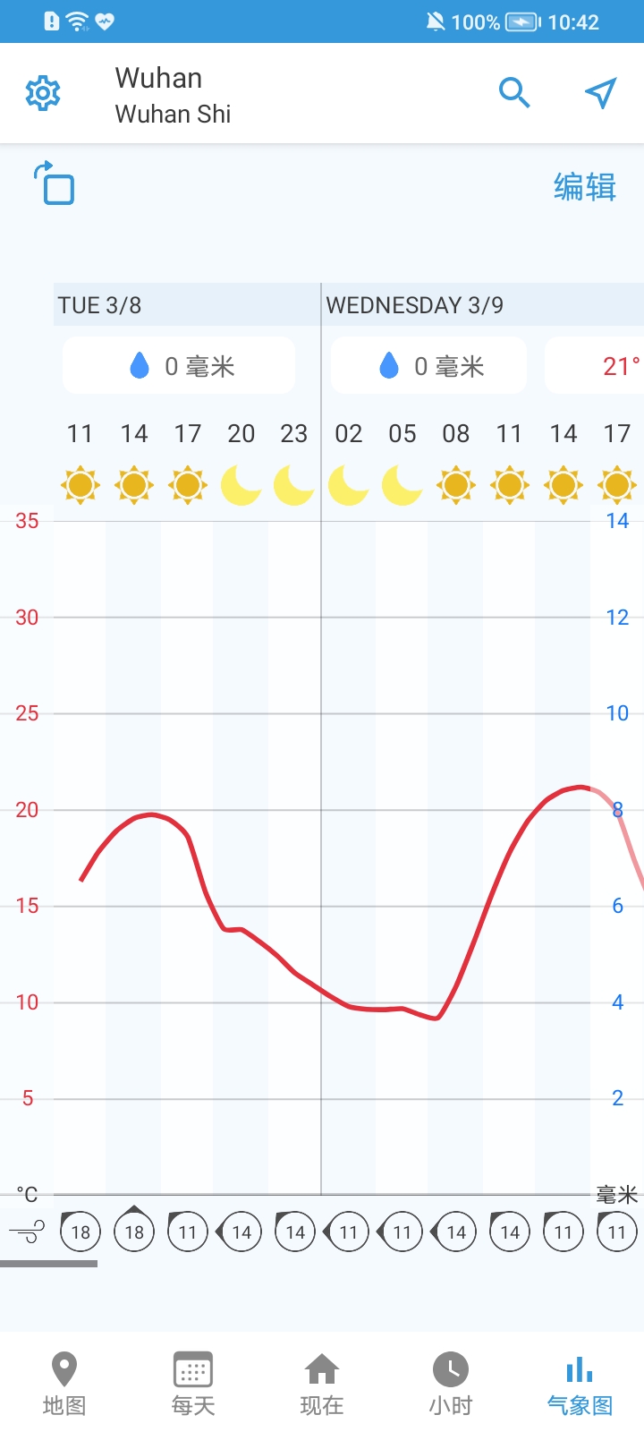 气象图视图可一目了然显示天气趋势。每小时3小时的预报将阵雨(虚线条)和连续降雨(纯蓝色条)分开。