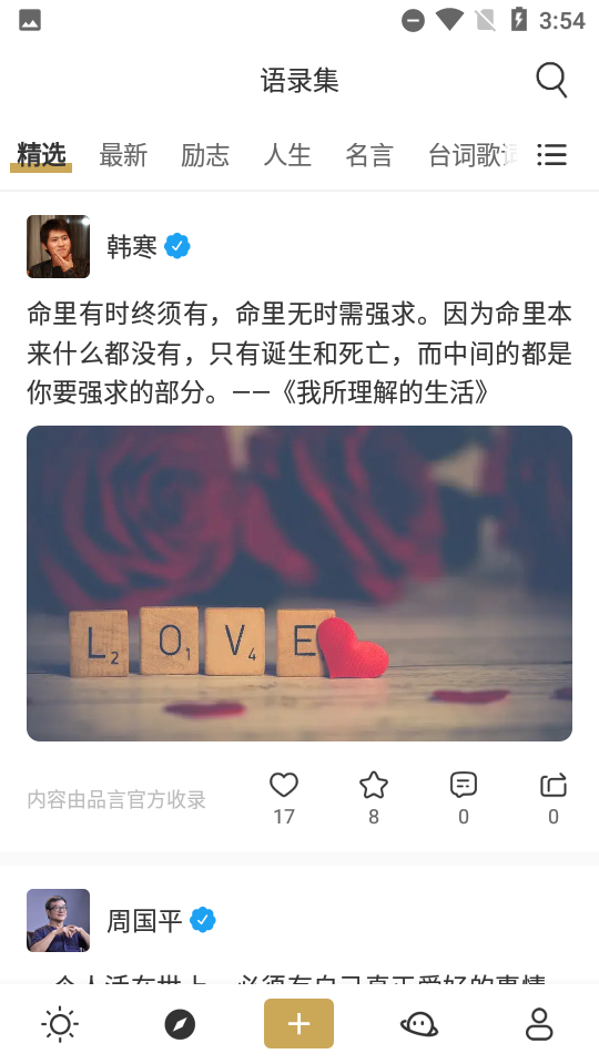3、品言里面的文案写的都挺好的,我最喜欢励志类的文案,它能鼓励我不断的前进奋斗,还有配图,每天都在更新,很好用,希望能有更多喜欢文案的朋友下载这个软件。