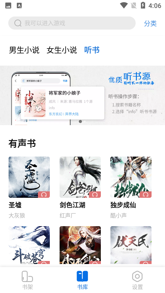 极简风格的首页--书架,这里把你加到书架上的看书资源和听书info资源区分开了,方便你下一次继续阅读或播放。
