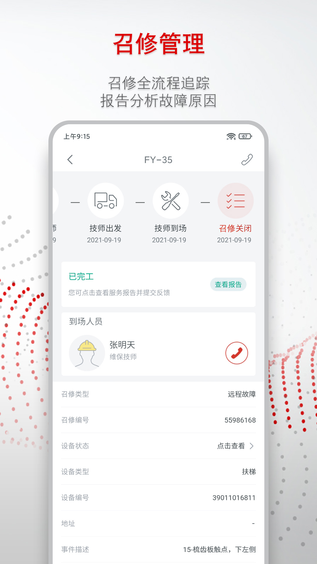 为有效管理电梯维保工作、提升电梯维保的工作效率和维保质量、实现无纸化维保而研发的一款供电梯维保人员现场作业使用的手机APP软件。