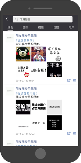 4、自带图文搜索功能,并按热门、搞笑、配图、微商、励志、百科、短视频等分类对朋友圈热门资源进行整理归类,让您能迅速找到您所需的素材。