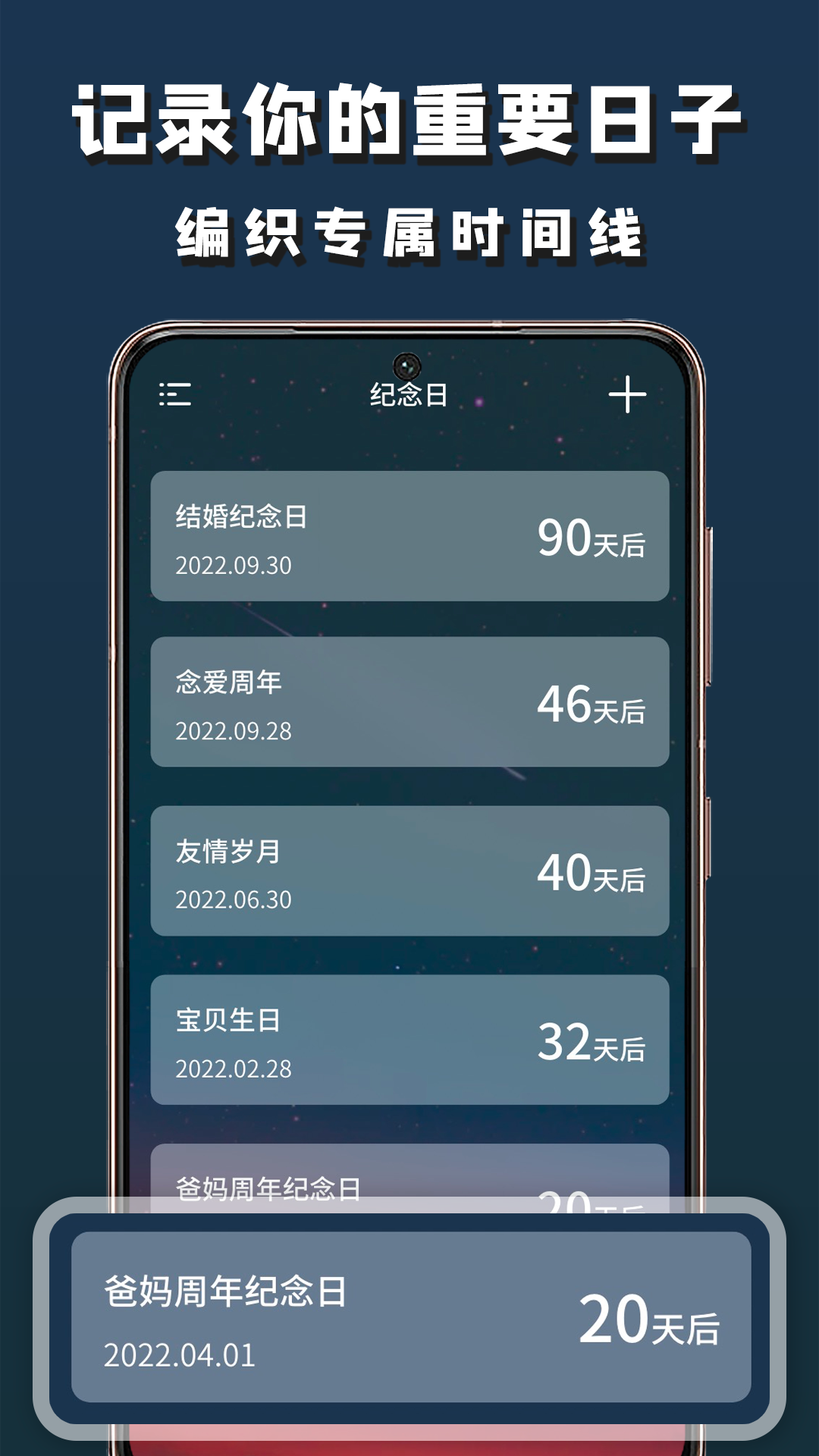 恋爱天数记录、记录结婚纪念日、恋爱纪念日的美好时光,既有正数日记录做恋爱纪念、恋爱计时记日子。生日节日纪念日倒数日,重要日期都在这里。恋爱中重要日子的倒计时和计时器小助手。