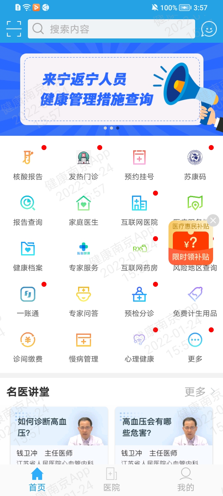 预约挂号: 支持南京地区各大医院的免费预约挂号服务,患者随时随地轻松预约挂号;