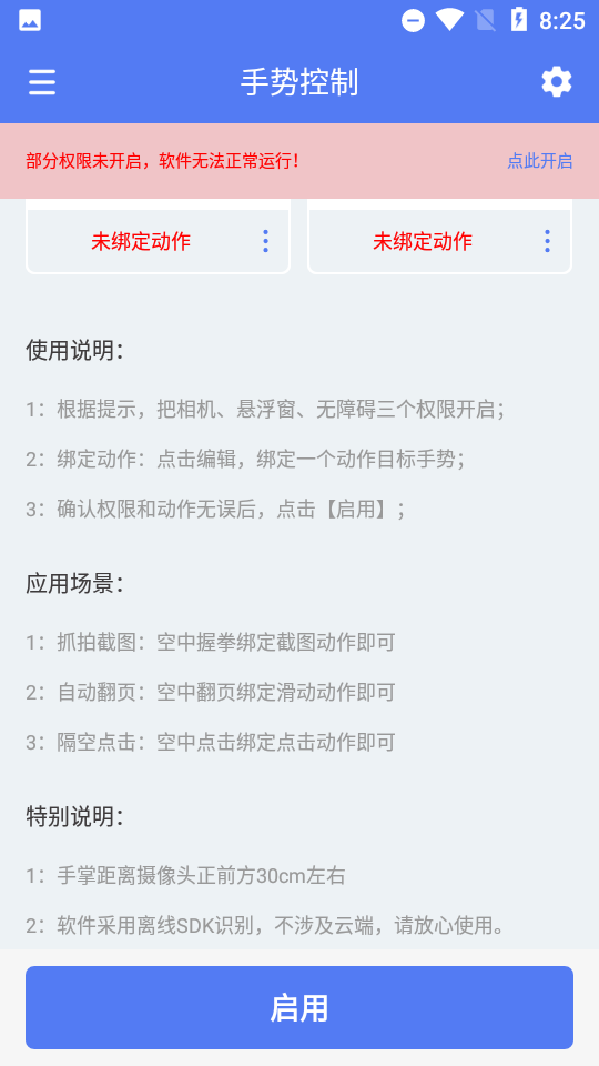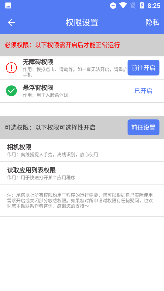 1:根据提示,把相机、悬浮窗、无障碍三个权限开启;