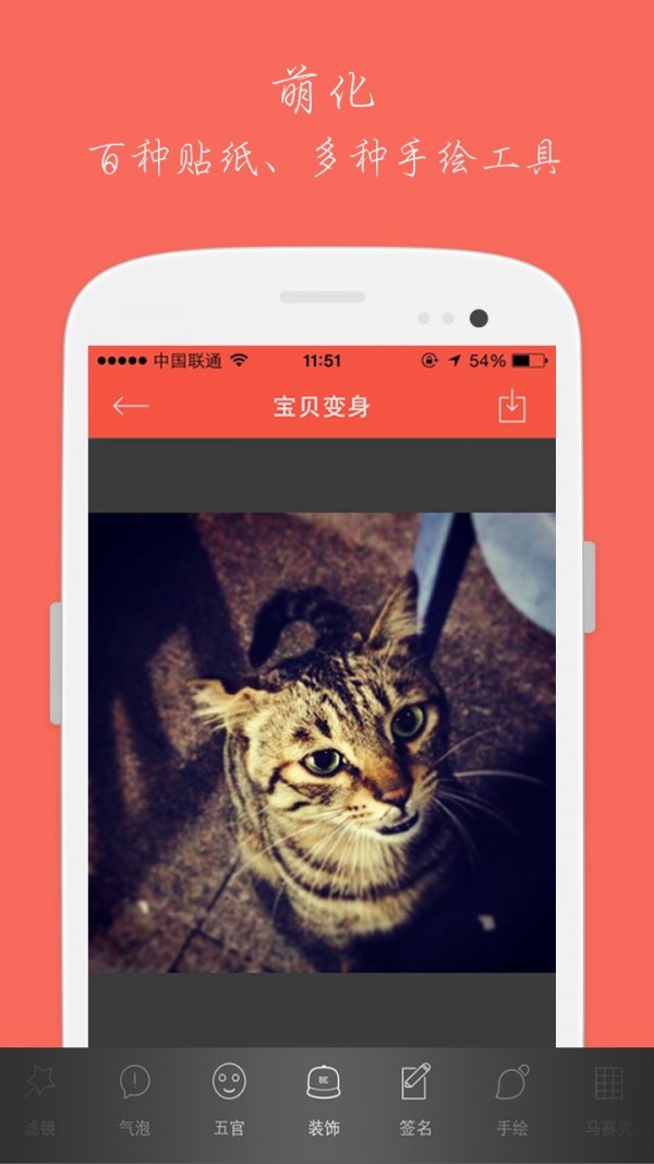 - 美化功能:全新光线滤镜、宠物专属文字气泡、五官、装饰、相框等素材,任意组合;