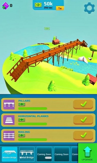 空闲桥梁设计是一个比较有趣的游戏,在这款游戏中,玩家需要找到不一样的解决思路,让桥边的人能过去,也能让车通过,游戏难度会逐步提升,需要玩家自己来探索,在这个游戏背景下,越来越多的人需要通过一座桥从这边通向另外一边,玩家需要靠自己的智慧来发挥想象,非常考验玩家的思维能力。通过对桥梁的完美设计让更多的人可以越过去。拥有着超级丰富的游戏体验。
