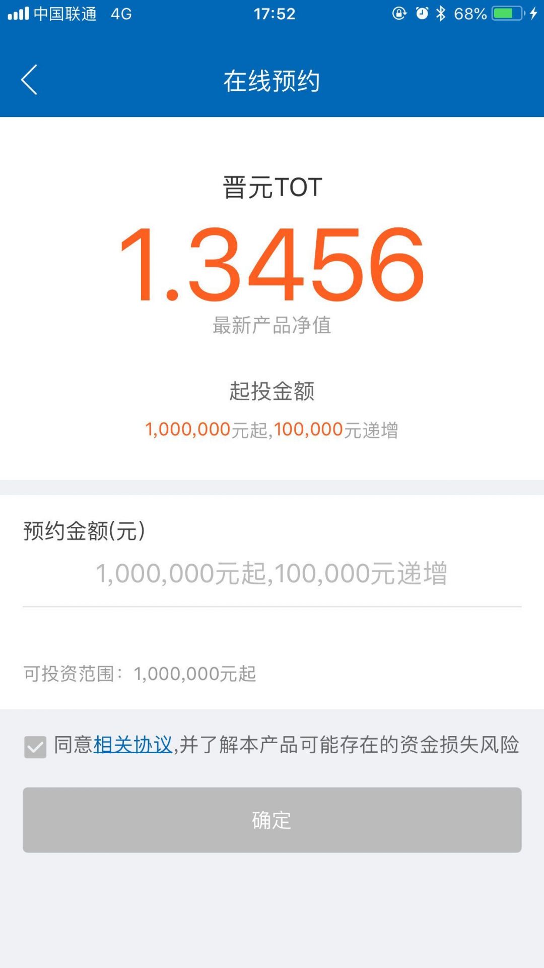 了解产品的起投金额后,即可输入相应的预约金额,同意相关协议后即可确定购买;
