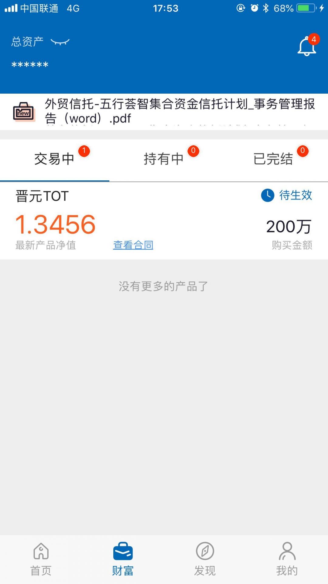 3、在财富界面,查看交易的状态和记录,并分类查看交易合同