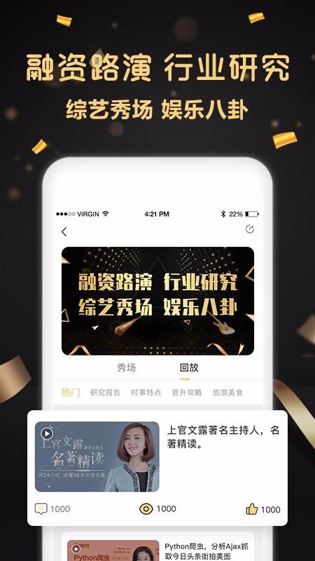 【秀场】自制综艺、各种活动大赛、金融大佬系列讲座等等内容丰富精彩!