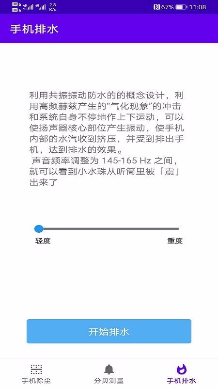 悦耳助手app利用声波震动的原理,调整至140-165HZ,可以将手机里的水震出来,不用拆手机就能解决手机进水的烦恼!