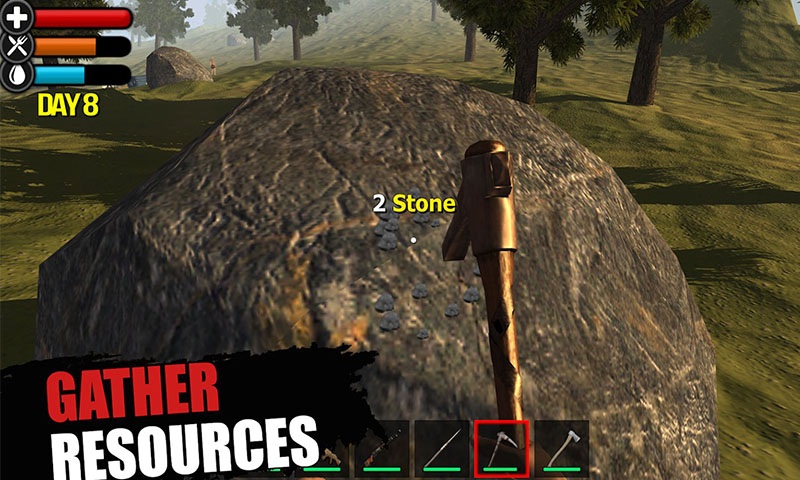 6、整个岛屿非常的小,可以动用的东西都会用文字显示,还可以捡起一些物品比如木头和石头,还可以利用匕首砍树木,不过不要过多使用,否则匕首会消失。