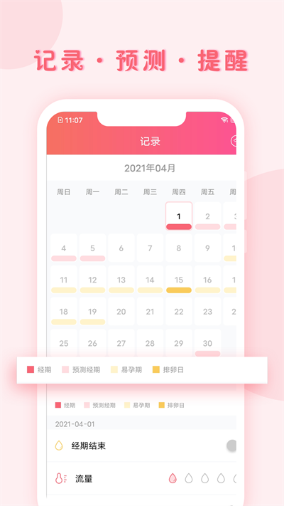 可以记录包含:流量多少、有无性爱、22种常见经期症状,以及私有记录