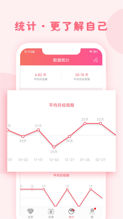 我们还将生理周期用图表形式展示,提供平均值,以帮助你更好的了解自己的经期情况