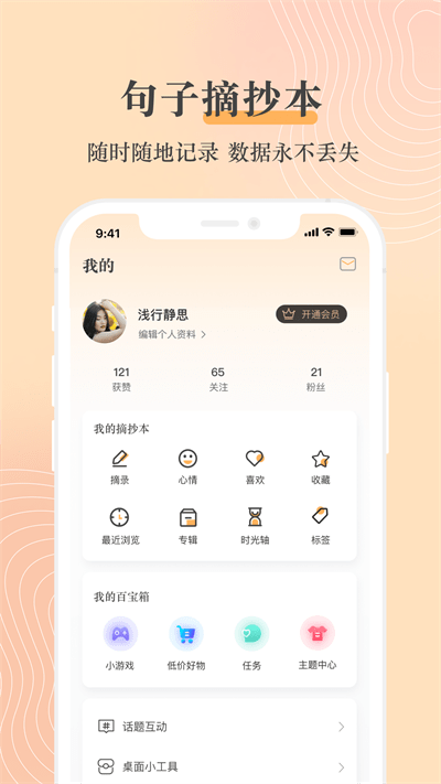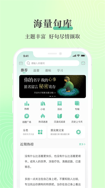 3. 浏览句子:在主界面浏览推荐、分类或搜索到的句子,喜欢的话可以点赞、收藏或分享。