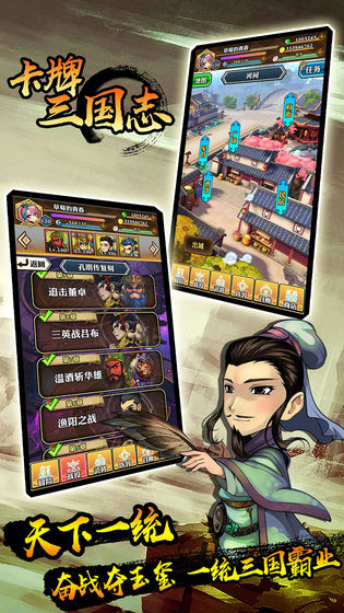 卡牌三国志》是一款以三国为背景的策略卡牌游戏,玩家扮演三国时期的君主,通过收集和培养各种武将卡牌,运用策略和智慧,展开一场场激动人心的战斗。