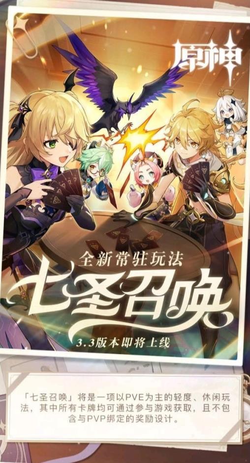 原神七圣召唤是米哈游旗下的热门游戏《原神》中的一个全新玩法,这是一款集换式卡牌游戏,玩家可以通过收集、强化和组合各种角色卡牌,构建属于自己的强大卡组,挑战其他玩家或AI对手。游戏画面精美,策略性强,深受玩家喜爱。