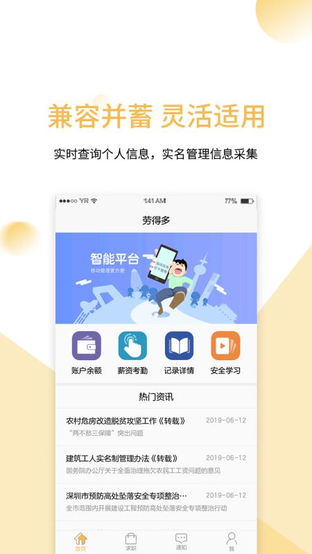 劳得多app为大家解决了劳务问题,平台提供了超多求职信息,您可以根据自己具有的技能在平台内查找合适的工作信息,非常的方便,很轻松的就能够为用户解决求职的问题;超多劳务机会,多劳多得,让你赚取到更多劳动报酬;同时,在软件中提供了打卡的功能,实时的考勤记录,可以轻松的知道自己的工作状态,如果考勤记录的信息发生异常,还会自动以消息的形式通知用户,这样就可以及时的处理考勤异常的信息了;通过实时的考勤记录就可以计算出自己的劳务报酬,避免的争议的情况,特别的实用,喜欢的朋友都可以下载软件使用。