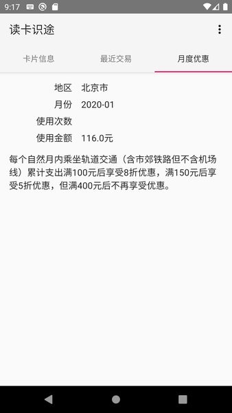 1. 智能识别:支持识别各类交通卡、公交卡、地铁卡等,方便用户快速查询卡片信息。