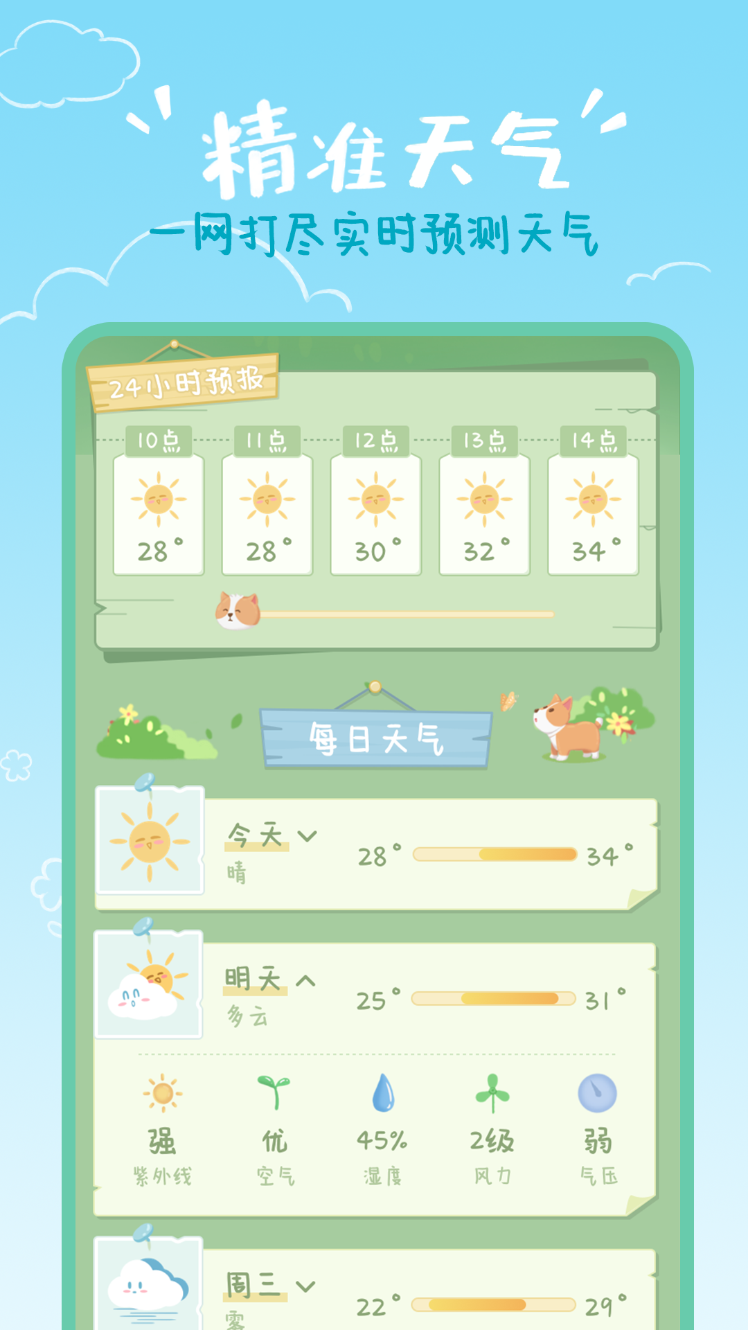 菜宠天气手机版采用先进的天气预测技术,提供实时天气更新,覆盖全球范围内的城市和地区。用户可以随时查看当前天气状况、未来几天的天气预报、生活指数以及空气质量等信息。同时,软件还支持多种语言,满足不同国家和地区用户的需求。