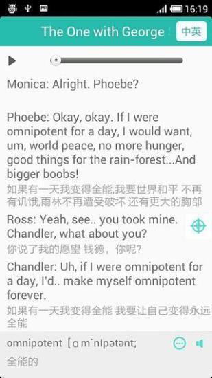 老友记学英语手机软件 v1.0 提供了完整的《老友记》剧集内容,用户可以随时随地通过手机进行学习。软件采用智能分词技术,将对话中的生词、短语和句型进行高亮显示,并提供详细解释和例句,帮助用户轻松掌握知识点。