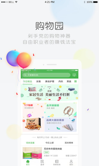 购物园app精选来自天猫、京东,淘宝各种优惠商品购买更划算,并且每日分享还可以赚钱一定的佣金进行购物哦!你值得拥有。