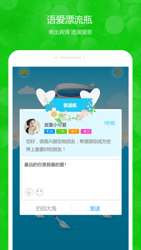 语爱漂流瓶app是一款基于匿名社交和语音交互功能的移动应用。它为用户提供了一个全新的社交体验,让用户可以在保护个人隐私的同时,通过语音的方式与全球各地的用户进行有趣的交流。