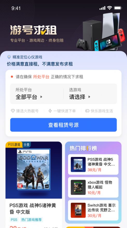 游号求租是一款专注于游戏账号租赁与共享的平台,为用户提供安全、便捷的游戏账号租赁服务。在这里,用户可以租用自己心仪的游戏账号,体验不同游戏带来的乐趣,同时也可以将自己的闲置账号出租,实现资源共享。