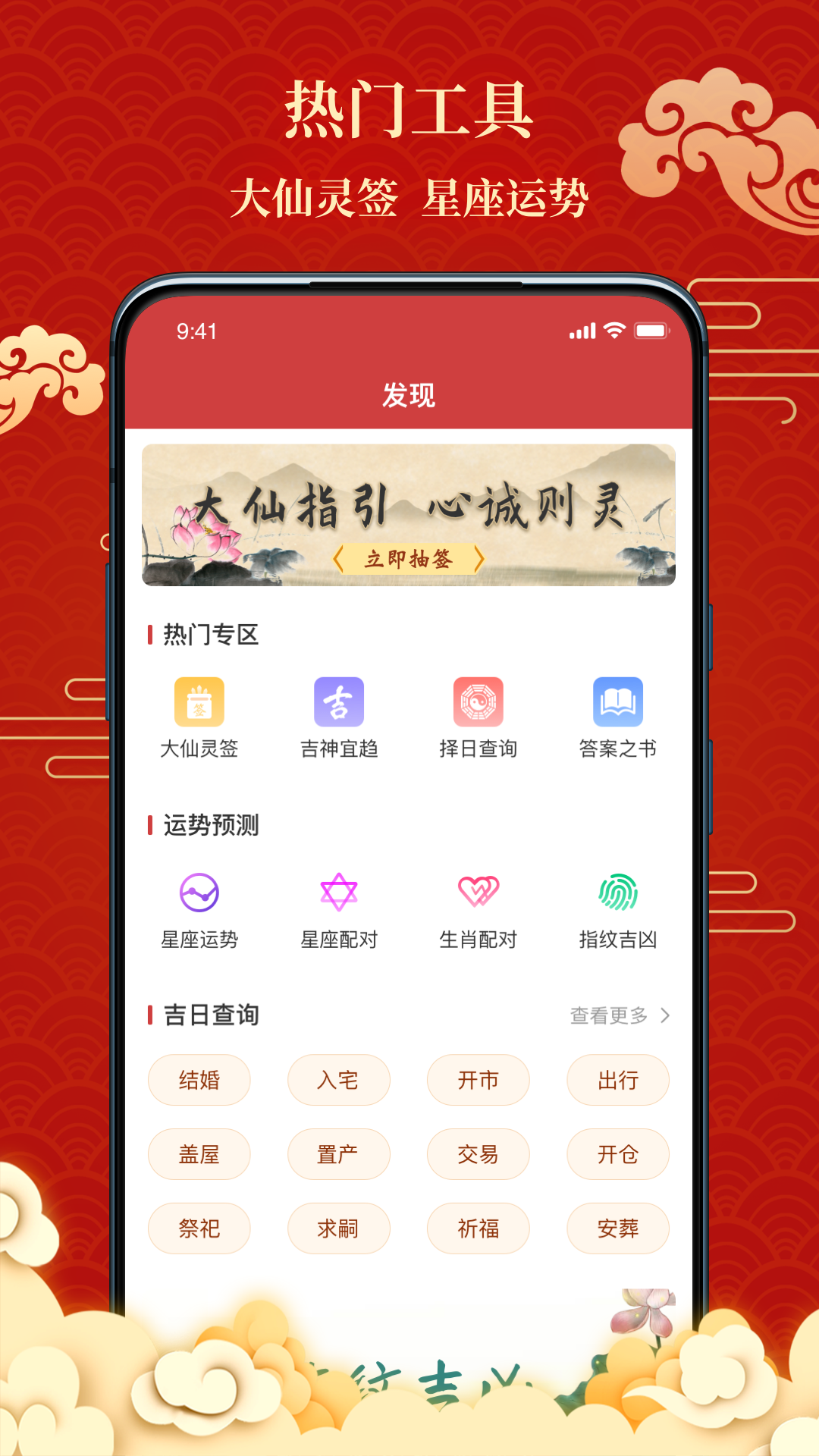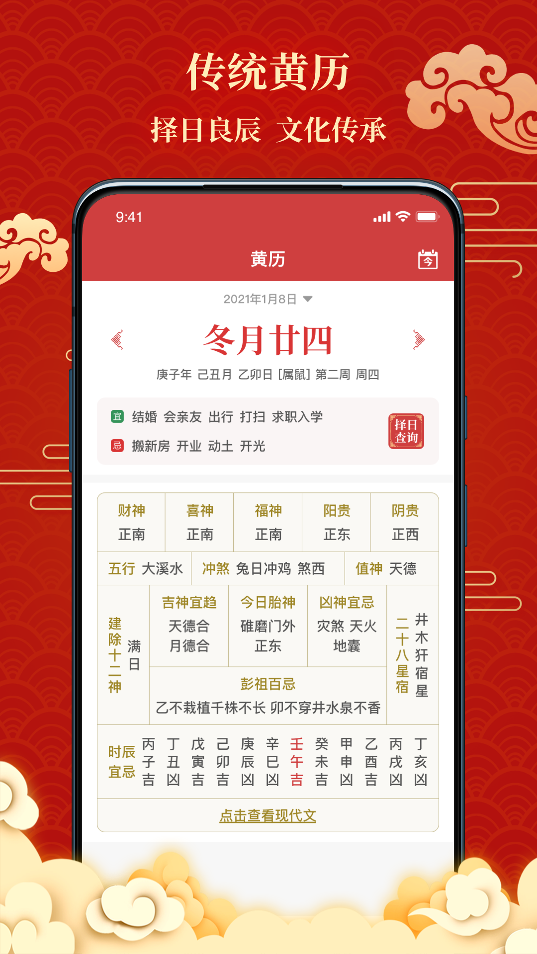 2. 黄历宜忌:根据传统黄历算法,为用户提供每日的宜忌事项,帮助用户合理安排日常生活和工作。