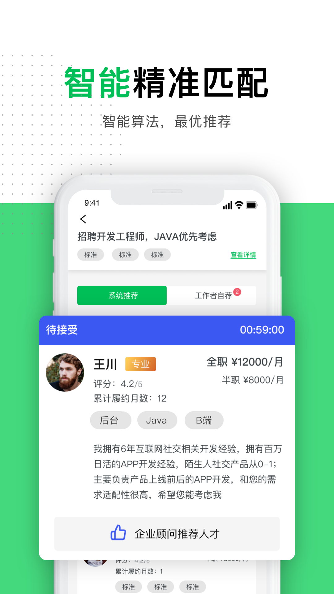 2. 智能匹配:通过智能匹配算法,精准对接企业用工需求与个人求职意向,提高匹配成功率。