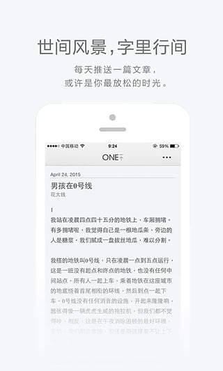 致敬韩寒,one一个文艺阅读软件,由知名作家韩寒亲自监制。在这个快节奏的时代,我们坚信优质内容的力量,为你精选好文,收录韩寒的全部小说,汇聚你喜欢的作者文章,更有志同道合的读者朋友。你可以分享读书笔记,展示摄影作品,一同探索文艺的多元世界,发现独特的视角。在one,我们共同致敬文艺,追寻生活的美好。