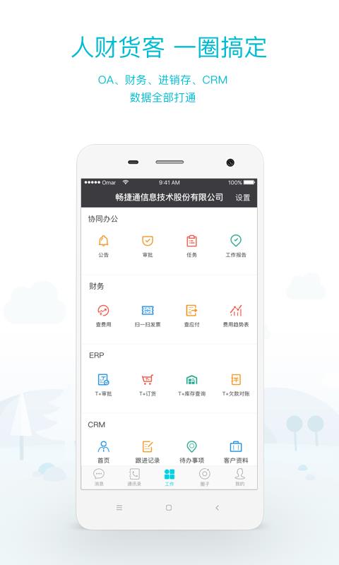 工作圈app是一款专为中小型企业提供的高效便利式办公软件,专注于协同工作和统计和核算方面,能够帮助广大企业有效提供业绩以及员工们的工作效率和动力。你可以通过软件接收和查看企业发布的通知公告、项目等,帮助你能够第一时间知晓最新情况,提高自己的工作效率也方便你能够安排和规划工作方案;app提供了工作报告功能,你可以将自己每天完成的工作任务提交到app中,方便管理部门查收和审核,同时还能随时查看审核的进度情况,十分便利;app拥有专属的财务板块,里面提供的扫一扫发票、查应付、 费用趋势报表图等等,帮助财务部门更好的记账和统计。