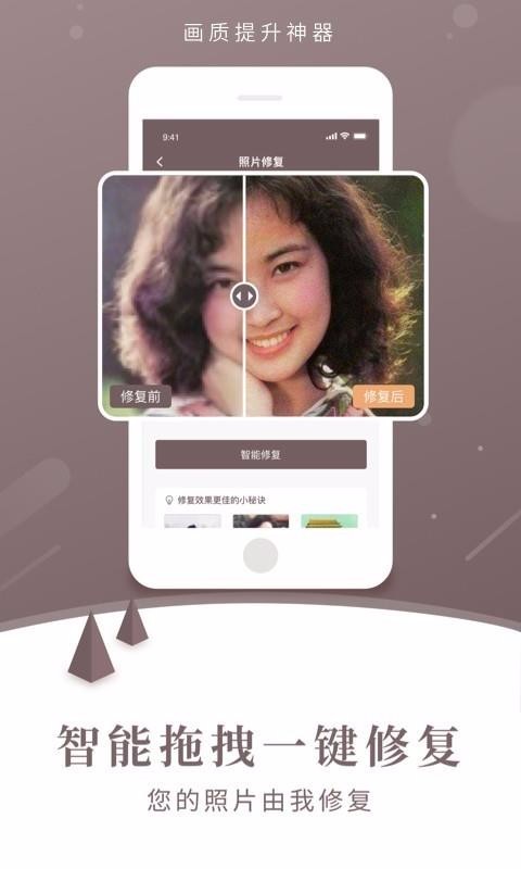 为黑白老照片添加更多颜色,不光可以进行黑白照片颜色的添加,还可以对照片进行智能修复处理,一些有瑕疵的或者是看着就非常模糊的照片,这款工具一键就可以智能修复,简单而且所修复的照片效果非常不错,不需要任何的专业技巧,人人都能轻松学会,赶紧体验下。糊照片、黑白照等都能够轻轻松松修复,提高画质感;手动式的操作步骤,不用培训、不用学习专业技术,通过应用老照片修复器app,各种各样相片都可以协助您恢复到刚拍摄的样子;可以对比图,让您了解修复照片的状况,浏览查询照片修复实际效果,完全免费保存画质清晰的修复照片;app会自动统计分析历史时间修复照片的状况,有利于用户在app内查寻历史时间修复照片,查询修复的相片。