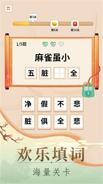 2. 在每个关卡中,玩家需要根据提示,在空白处填入合适的词语。