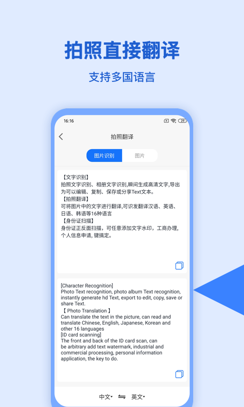 4. 拍照翻译:支持多国语言,快速精准翻译扫描文档中的文字内容。