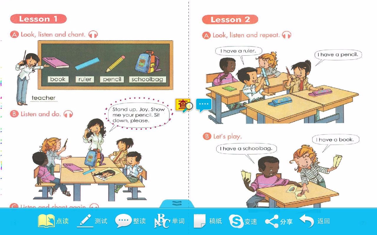1. 课本点读:点击发音区域,第一次英文发音,第二次中文发音。句子单词、人物皆可点读。