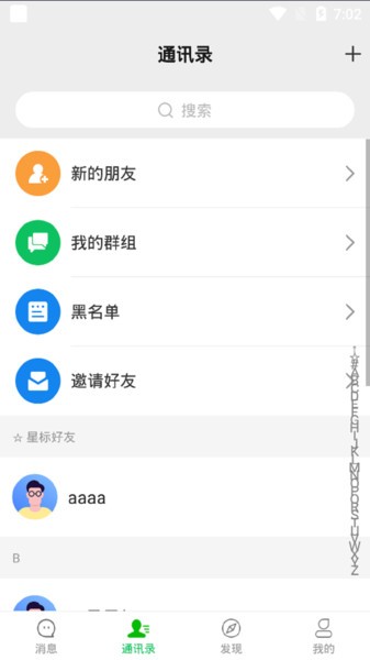 4. 进入通讯录中,查看新的朋友、群组、黑名单、邀请好友、好友列表等功能。
