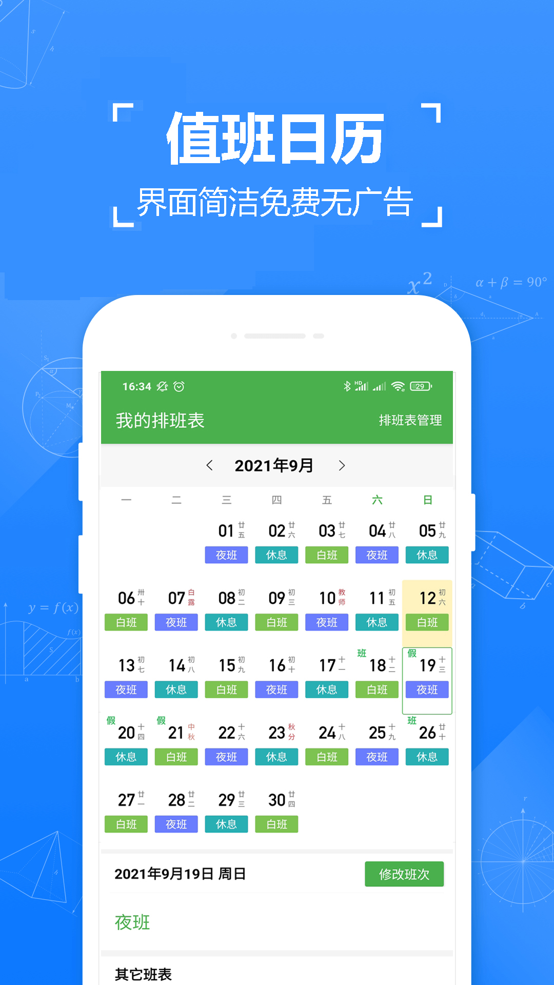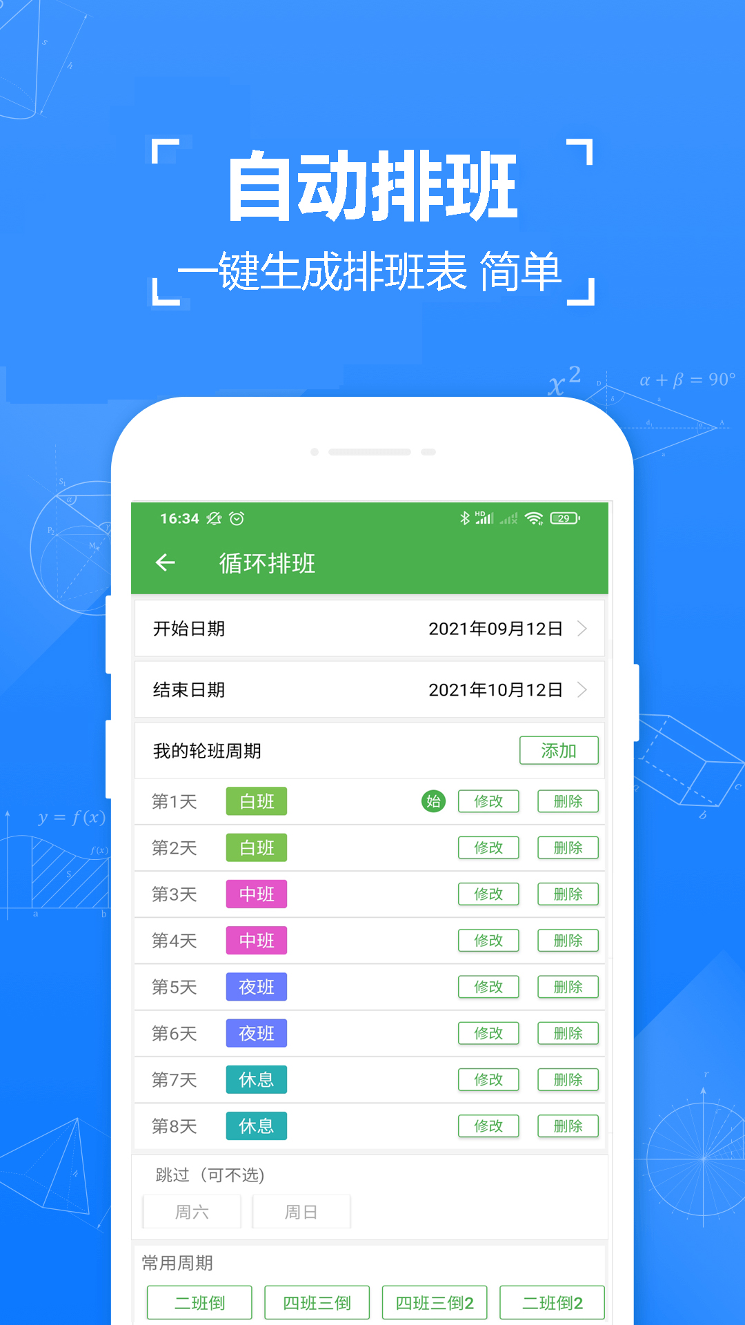 2. 自定义规则:支持用户自定义排班规则,如工作时间、班次类型、休息日等,满足用户个性化的排班需求。