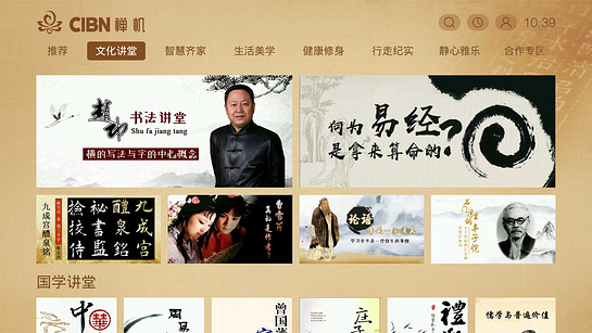 CIBN禅机是由CIBN互联网电视国广东方网络(北京)有限公司播控和运营的一款电视应用,专注于分享佛家、道家、儒家等中华传统文化。它综合了视频、音频、图文等多种形态,以直播、轮播、点播、游戏等形式,向用户展示传统文化的魅力,旨在帮助用户修身养性,参禅悟道。