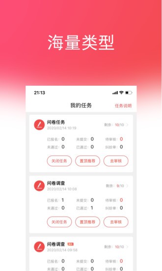 1. 任务大厅:提供多种类型的任务供用户选择,如每日签到、问卷调查、砍价助力、邀请好友等。