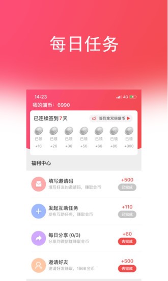 2. 邀请好友:利用喵互助的邀请机制,邀请好友加入并完成任务,双方都能获得额外的喵币奖励。