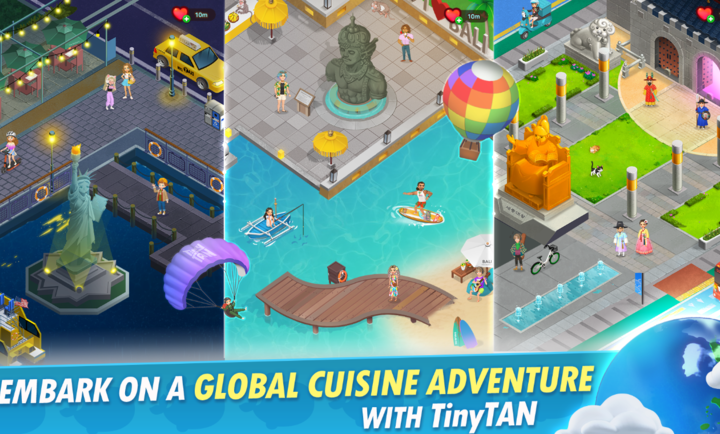 1. 游戏背景:玩家将扮演一位厨艺高手,与TinyTAN一起游历世界各大城市,如首尔、纽约、巴厘岛等,为顾客烹制当地特色美食。