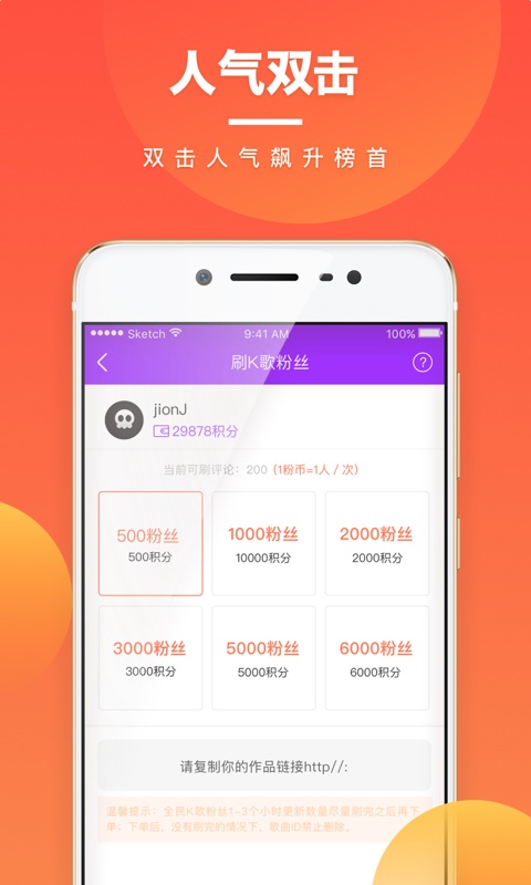 1.支持刷粉、刷播放量、双击、全民K歌刷粉、K歌刷评论和鲜花,增加全民K歌试听量,提升歌曲人气,还可能荣登红人榜,一曲成名噢;