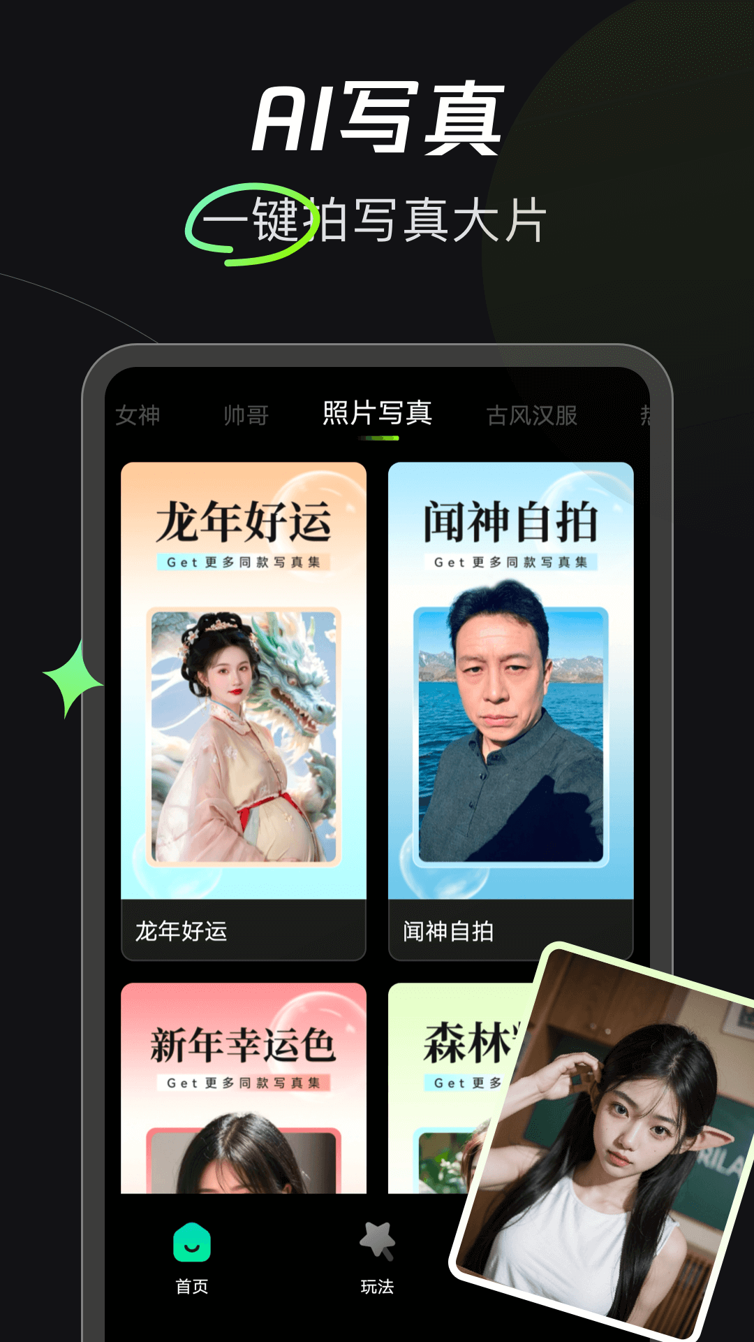 1. AI换装:利用AI技术,用户可以选择心仪的服装并上传个人图片或视频进行实时换装,体验不同风格的自己。无论是民国旗袍、民族服装还是汉服等,都能轻松实现。