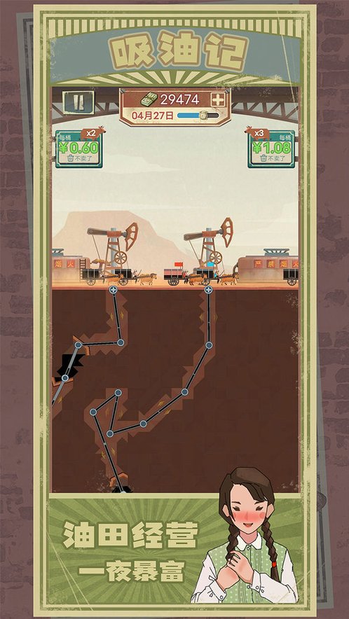 《吸油记》是一款充满创意与趣味性的模拟经营手游,玩家将扮演一名石油大亨,在广袤无垠的土地上勘探、开采石油,并通过智慧经营,将小小的油井发展成庞大的石油乐趣帝国的同时。,游戏也能融合了体验到策略石油规划行业的、资源管理、市场波动等多重元素,让玩家在享受经营起伏与挑战。