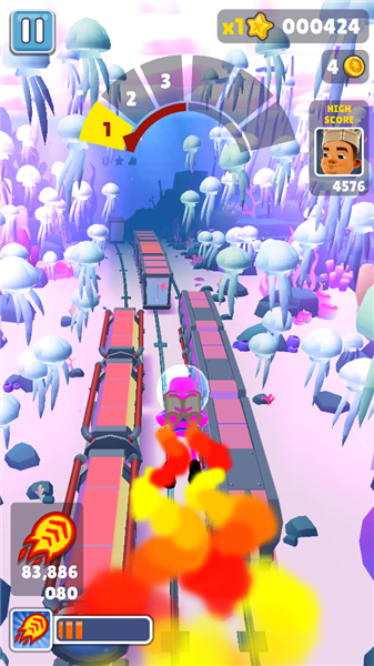 2. 操作方式:通过滑动屏幕控制角色左右移动、跳跃、下滑,躲避迎面而来的火车和其他障碍物。