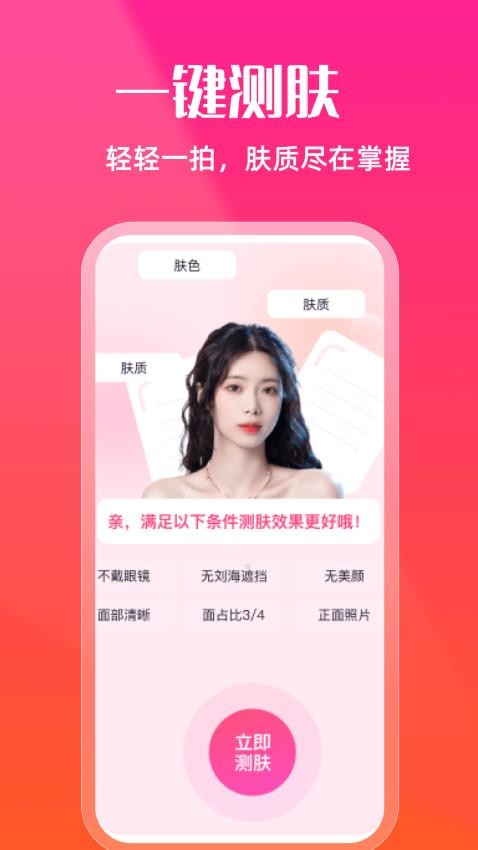测肤质免费版是一款专为关注肌肤健康与美容的用户设计的智能应用。它利用先进的图像识别技术和大数据分析,帮助用户快速、准确地了解自己的肤质类型及当前肌肤状态,为用户提供个性化的护肤建议与产品推荐。无需专业设备,只需通过手机摄像头即可完成肤质检测,让护肤变得更加科学、便捷。