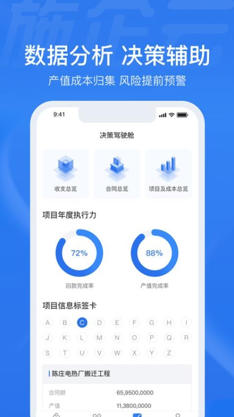 3. 可视化数据展示:通过图表直观展现项目成本、资金流向与现场进展,便于决策分析。