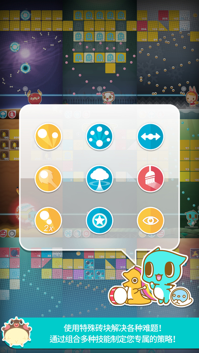 3. 角色与道具:游戏中有多种可爱的角色和道具可供收集和使用。每个角色都有独特的技能,可以帮助玩家更高效地消除砖块。道具则能在关键时刻提供额外的帮助,如增加弹珠数量、改变弹珠属性等。