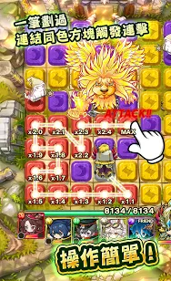 1. 消除玩法:玩家通过连线消除同色方块,让主角和对应属性的魔物沿路径移动并攻击敌人。消除数量越多,攻击力越大,还能积累能量释放大招。